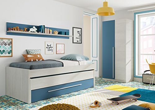 Pack Habitacion Juvenil Con Cama Nido Estante De Pared Armario Y Somieres Incluidos Color Blanco Y Azul